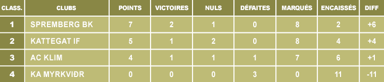 Si Kattegat veut se qualifier il lui faut obligatoirement une victoire en comptant sur Spremberg pour faire le boulot face à l’AC Klim. La rencontre face au petit poucet qui n’a pas marqué un seul but doit être une simple formalité pour les Bersekers. Dès la 9e minute, le VAR intervient pour déterminé si une faute a été faite dans la surface du KAM ou à l’extérieur. Pour cette fois, c’est un coup-franc mais une minute plus tard, nouvelle intervention du VAR et cette fois, pénalty pour une faute de Vella sur Bilos. C’est Pavelka qui s’empare du ballon et ouvre le score. 1-0. Pas le temps de souffler pour KAM, à la 16e minute, Sveinsson s’empare du ballon et part dribbler 3 joueurs avant déclencher une frappe du gauche, le gardien adverse est top court. 2-0. Le KAM confirme son statut de plus mauvaise défense du championnat et le score aurait pu être plus lourd sans les arrêts de Farrugia. A la 27e minute, suite à un corner tiré dans la surface par Caprari, Osbern impose son physique et alourdit la marque de la tête. 3-0. Myrkviðr peut maintenant jouer l’esprit libre car il sera difficile de revenir dans le match au vu du niveau affiché. D’ailleurs leur premier tir intervient à la 30e minute par Debattista mais le ballon s’envole. Kattegat contrôle le match et enchaîne les corners. Sur le renvoi d’un de ceux-là, le ballon revient dans les pieds de Ludvigsson qui contrôle avant de frapper du gauche et de tromper le portier. 4-0. En une mi-temps, le KIF a fait le boulot.
