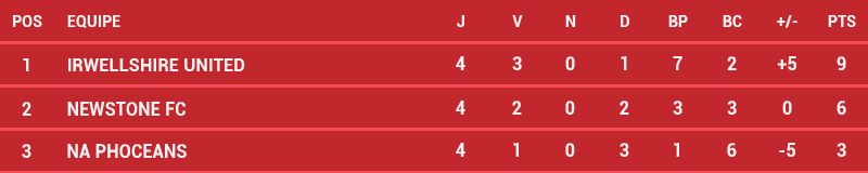 Avant dernier match dans ce Groupe A : Irwell recevait Newstone pour la finale du groupe. L'équipe qui s'impose est qualifiée pour la finale. On s'observe beaucoup en ce début de match, mais les Red Raccoons sont les premiers à se mettre en évidence. Après une occasion repoussée par le gardien, Jonathan Viera se retrouve seul au second poteau et reprend tranquillement un centre de Coleman pour ouvrir le score. 1-0 pour Irwell à la 23ème minute de jeu. Viera est le moteur d'Irwell dans cette compétition pour l'instant et il se procure deux occasions supplémentaires avant la mi-temps, qui sont repoussées par la défense. Les locaux ne relâchent pas l'étreinte et on assiste clairement au match inverse de la rencontre allée. Même si la possession est équilibrée, les Sailors ne se procurent pas d'occasion franche alors que Nicolas Serre trouve le poteau à la 75ème et manque le break pour Irwell. Les Ratons contrôlent la fin de match et même si les deux équipes se procurent quelques occasions, elles sont trop timides pour faire mouche. Irwell s'impose par le plus petit des scores et assume son statut de favori du groupe en accédant à la finale, sauf défaite par plus de 2 buts face aux NA Phoceans.