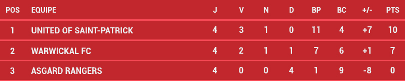Pour continuer à espérer, Warwickal devait s'imposer en déplacement à Asgard, avant un match décisif à domicile. Les deux équipes se procurent des occasions en début de match, et si les plus franches sont côté Asgard, Jerry Khan est solide dans ses cages. En fin de première mi-temps, la tendance s'inverse, mais Supram répond à son homologue pour conserver un score nul à la pause. En seconde période, ce sont bien les Lion Lads qui prennent le dessus, mais les Rangers ne plient pas ... Jusqu'à ce missile d'Ivan Marcone à deux minutes de la fin du temps réglementaire. Le milieu profite d'une passe en retrait de Sukjaerson pour frapper sans contrôle bien au-delà de la surface. Cette fois, Supram n'y peut rien et le ballon transperce les filets. Les Lion Lads assurent le minimum syndical et joueront le match de la qualification à domicile face à Saint-Patrick.