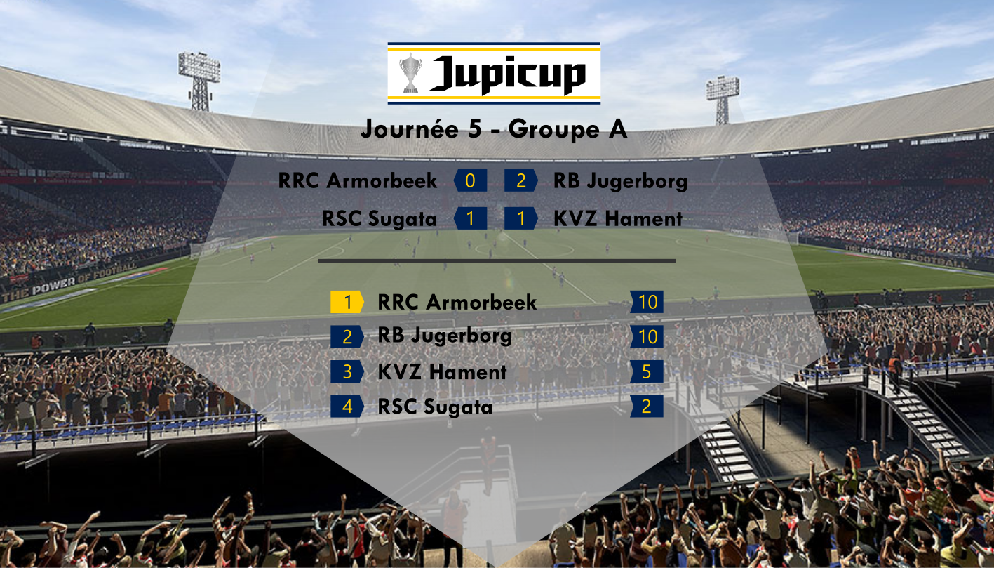 En seconde période, Armorbeek doit contourner le bloc de Jugerborg. Les phases arrêtées sont la clé mais Ulloa et De Smet échouent sur corner et tombent sur un Bernard Imbert des grands soirs sur sa ligne. Avec des latéraux qui poussent haut pour le surnombre, le RRCA se découvre. Mas en profite à nouveau pour alerter Ehlert sur la gauche. Son centre connecte avec Kuan Bishop qui arrive en pleine course et place dans le plafond pour le 0-2. Douche froide dans un Boswijk qui se préparait pourtant à fêter l'accession à la finale. Jugerborg vient contre-carrer les plans des locaux en maintenant le score jusqu'au coup de sifflet final, parfois de manière rugueuse. En témoigne l'intervention très musclée de Jelle De Smet (oui, il y a des De Smet dans les 2 équipes, c'est la Jupicup) qui oblige Monsieur De Smet (l'arbitre aussi s'appelle De Smet) à montrer la rouge à son homonyme jugerbourgeois à la 89e. En clair, le Red Bull finit à 10 mais s'impose et relance le suspense pour la qualif dans ce groupe A.