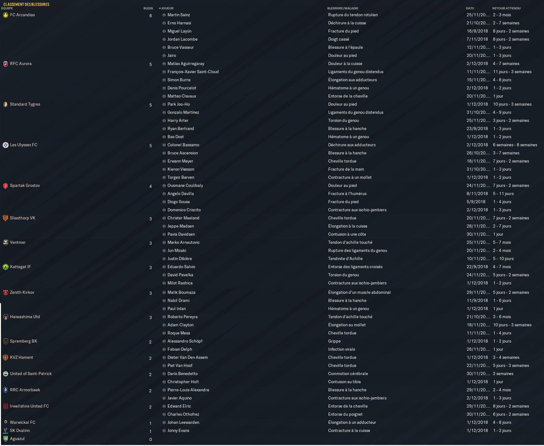 Arnautovic (Ventmer), Mizaki (Ventmer), Salvio (Kattegat), Pereyra (Heiw. Utd), Sainz (Arcandias) et P-L Alexandre (Armorbeek) sont les blessés de longue durée dans la liste des éclopés de S-Ligue 1.