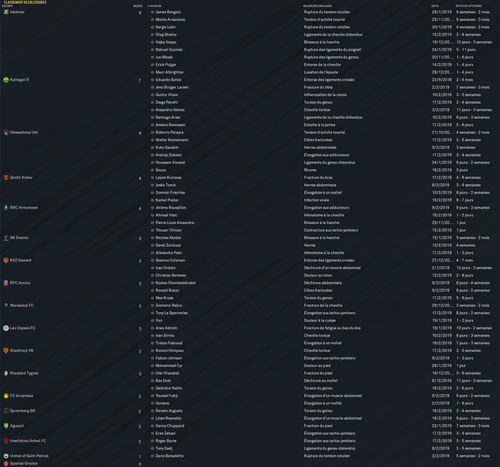 A Heiwashima, Zivkovic et Kannemann seront absents environ un mois. Enième blessure au Ventmer avec Shatov, heureusement moins grave qu'initialement craint. Kurzawa (Kirkov) sera lui sur la touche de 4 à 6 semaines. Signalons encore les indisponibilités de Zahavi (Aguazul), Renato Augusto (Spremberg) et Hiroyasu (Sliasthorp).